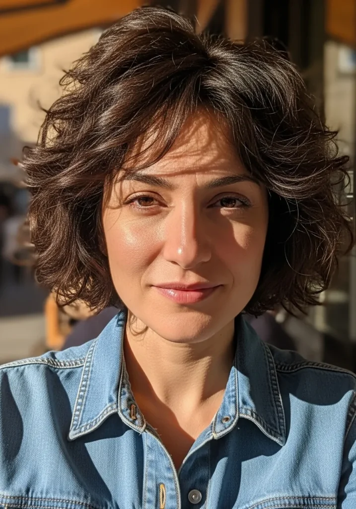 With its soft, round curls, this short curly bob is full of life. The curls are voluminous and have just the right amount of bounce, framing the face beautifully. The natural hair color shines under the soft sunlight, enhancing the textured waves that give off a relaxed and stylish vibe.