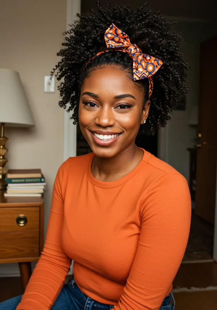 This look bursts with personality and texture. The natural curls are pulled up into a voluminous puff, accentuated with a bold patterned headband tied into a bow. The curls frame the face beautifully, giving the style a joyful, confident vibe that feels so festive.