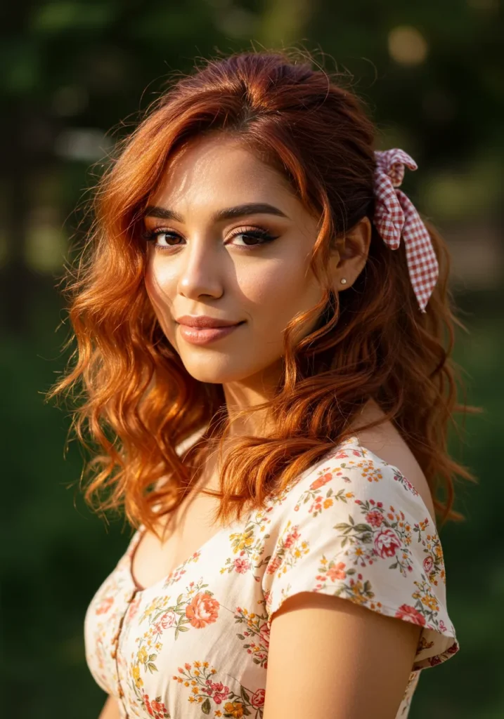 This shoulder-length copper hairstyle is styled in loose waves with a soft side part and a red-and-white gingham bow clipped at the side. The warm hair color glows in the sunlight, giving it a cheerful, autumn-ready feel.