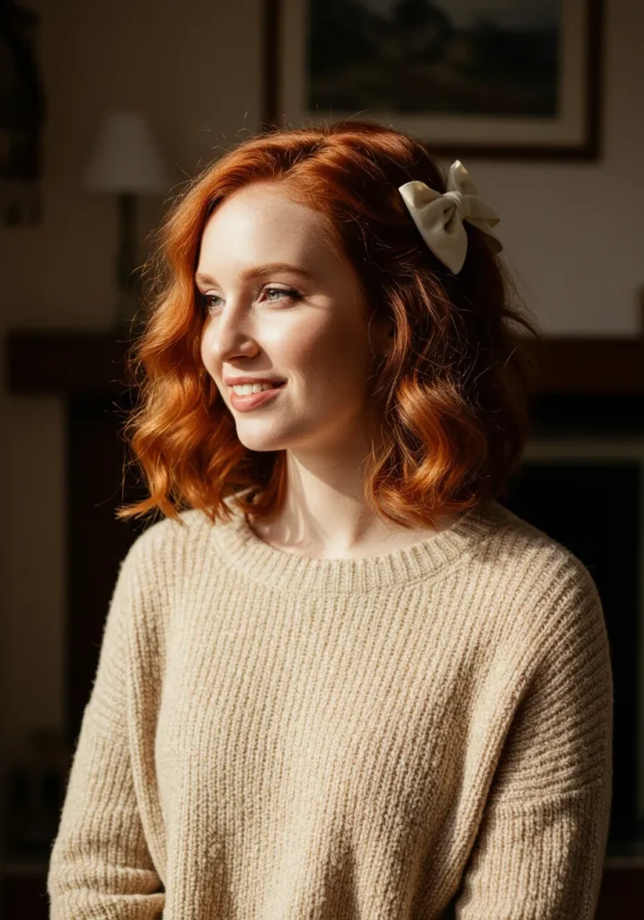 This medium-length ginger hairstyle shines with bouncy curls and a natural side part, finished with a cream bow pinned just above the ear. The light hits the copper tones perfectly, giving the waves warmth and depth.