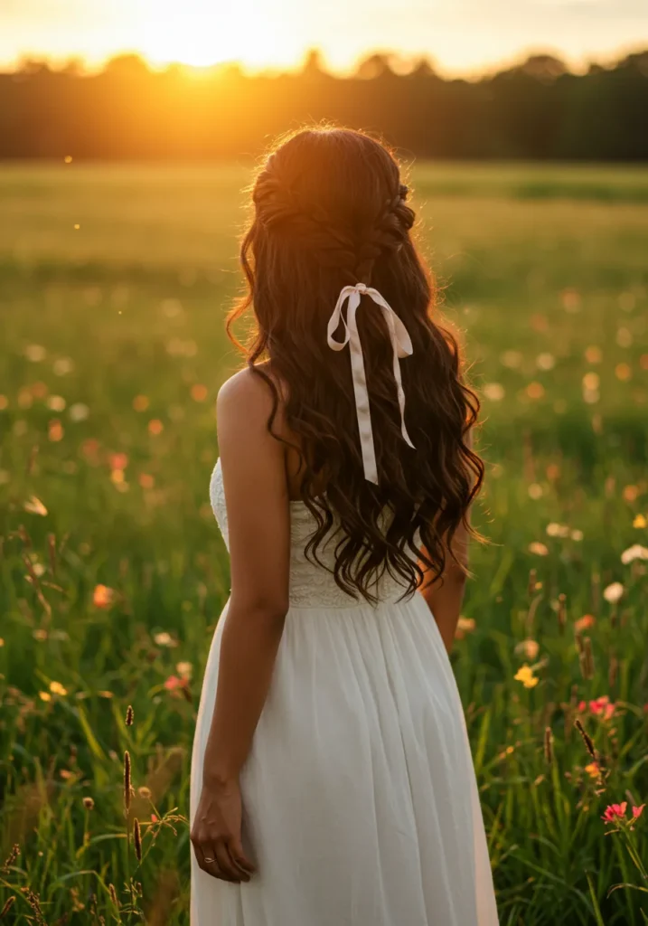 This dreamy hairstyle features long brunette waves cascading down in soft, effortless curls, tied at the back with a delicate ivory ribbon. The hair is loosely braided near the crown, adding subtle texture and movement. The sunlight catches the soft waves, giving them a golden glow that feels straight out of a fall afternoon.