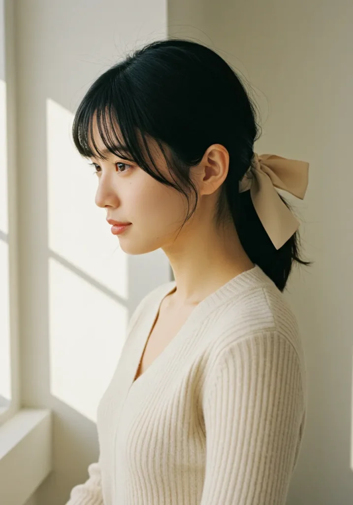 This minimalist hairstyle features a smooth, low ponytail tied neatly with a beige satin bow. The hair is slightly tousled with soft pieces framing the face for a relaxed finish. The neutral tone keeps it simple, elegant, and versatile.