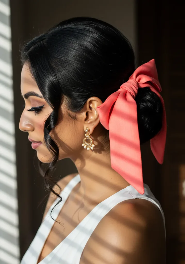 This sleek low bun shines with a smooth, polished finish and a coral pink bow tied neatly at the base. The hair is pulled back cleanly, showing off its glossy texture and gentle face-framing curls. The bright bow adds a cheerful pop of color that makes the style feel lively and festive.