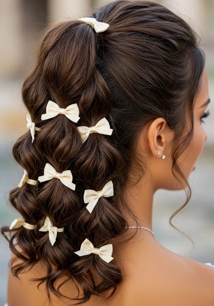 This unique look features cascading chocolate-brown curls tied into a high ponytail, decorated with tiny cream bows throughout the lengths. The multiple bows create a whimsical effect that’s both festive and elegant.