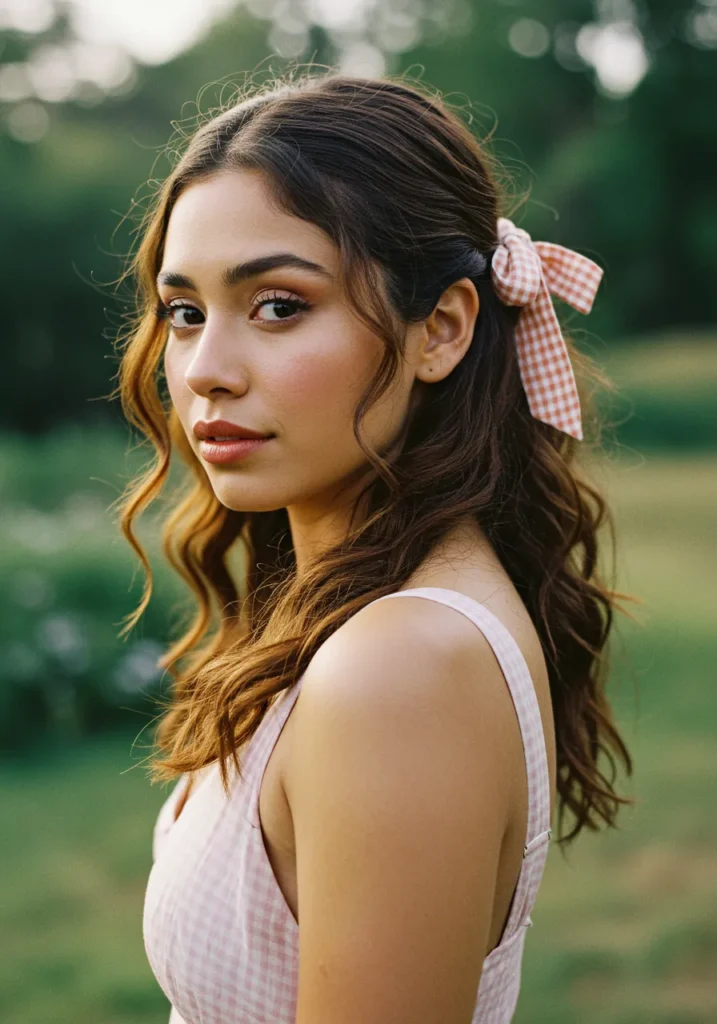 This adorable style pairs soft dark waves with a half-up twist secured by an orange-and-white gingham bow. The ribbon brings a sweet, playful energy while the loose curls keep it feminine and flattering.