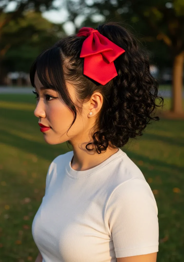 This playful hairstyle features dark, glossy curls pulled into a high ponytail and finished with a bold red satin bow. The rich color of the bow stands out beautifully against the dark curls, adding an eye-catching contrast. The loose curls fall softly, giving it a fun and flirty feel.