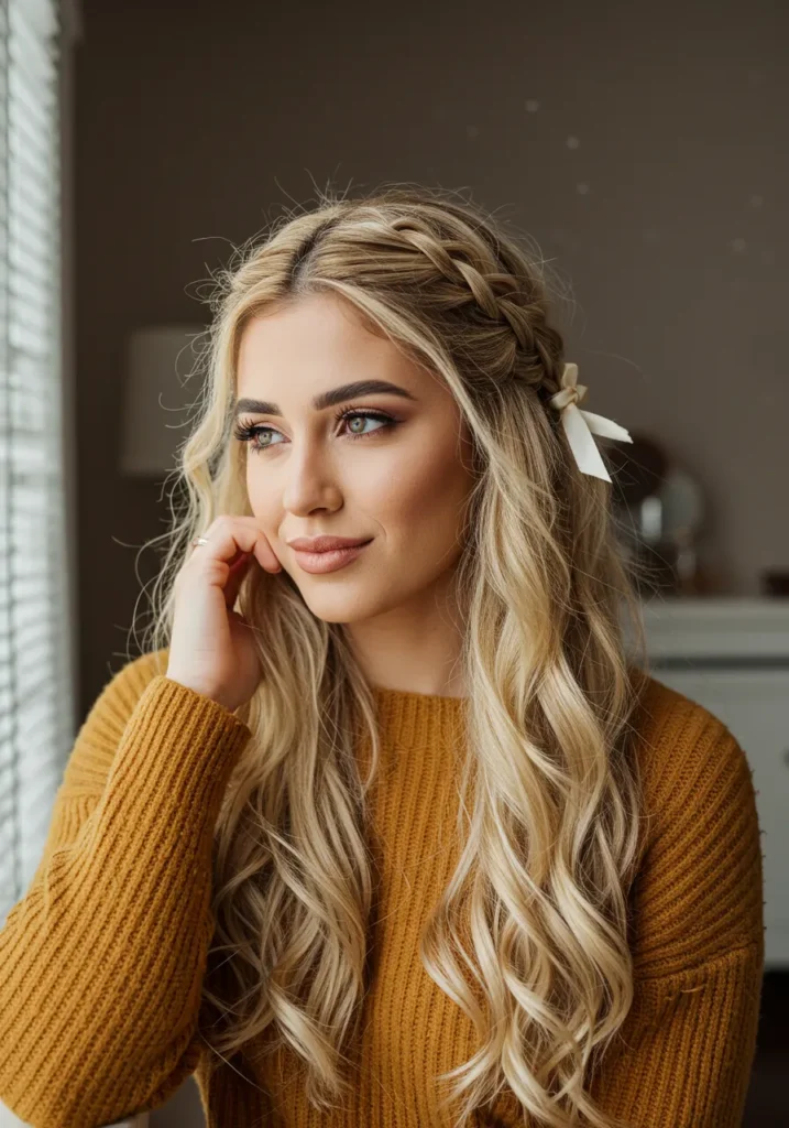 This hairstyle features long blonde hair styled into a loose side braid crown, finished with a delicate ivory ribbon bow. The waves cascade softly down, catching the light beautifully. The braid adds texture and charm, while the bow gives it a romantic, almost storybook finish.