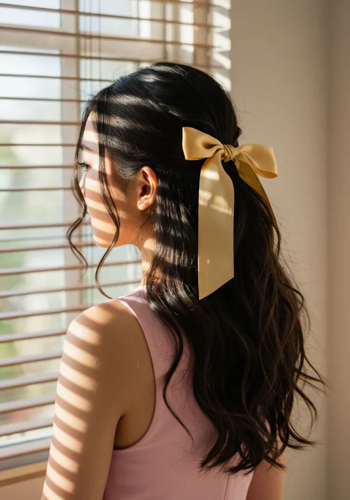 This elegant style pairs shiny dark brown waves with a soft yellow satin bow tied at the back of a half-up hairstyle. The bow contrasts beautifully with the dark tones of the hair, catching the sunlight filtering through the blinds. Gentle curls frame the face, giving the whole look a soft and feminine finish.