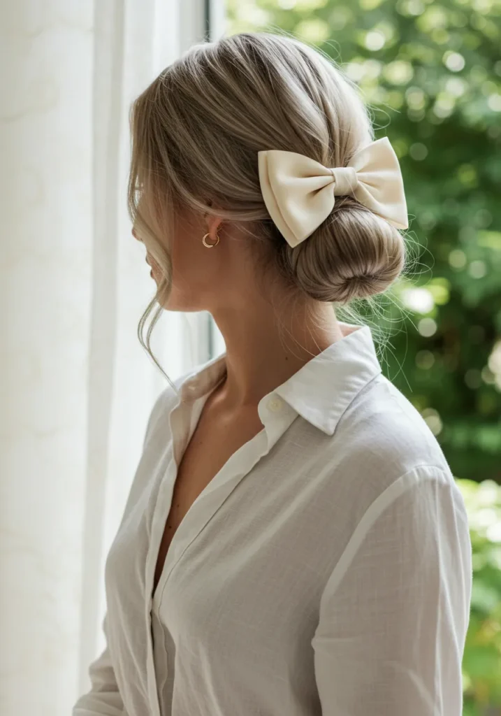 This classic low bun is the definition of effortless sophistication. The light ash-blonde hair is neatly tucked into a smooth bun, secured with a cream satin bow that adds just the right touch of charm. A few loose strands frame the face, softening the overall look.