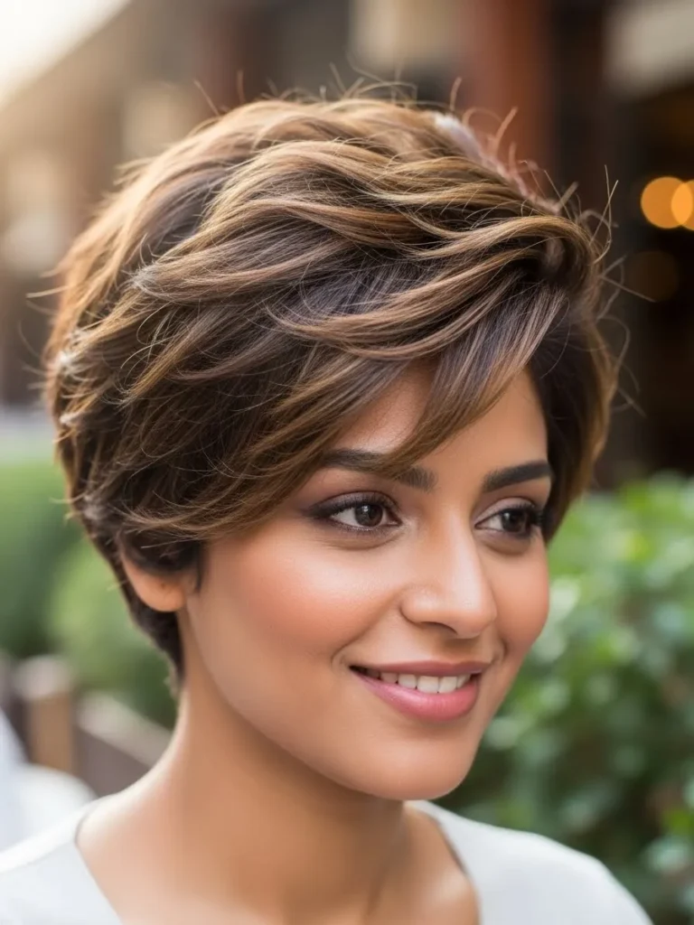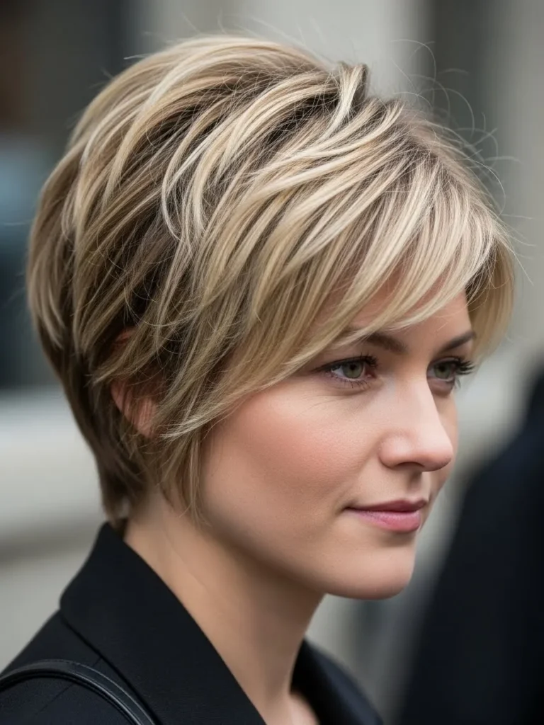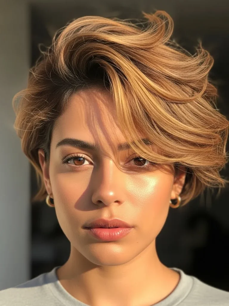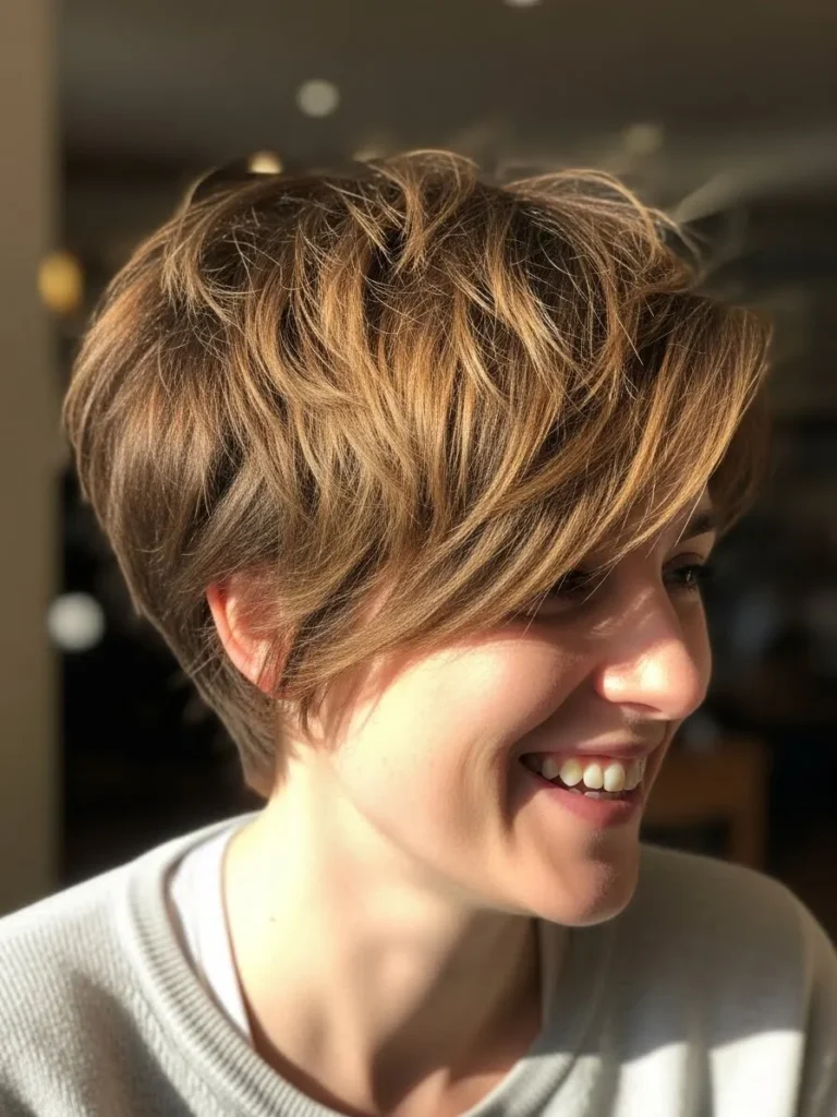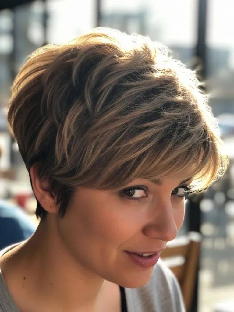 This style is perfect for those who love a low-maintenance pixie with a little extra body. The layers provide just the right amount of volume, and the highlights add a beautiful sun-kissed effect that brightens the face. It’s both chic and practical, making it perfect for daily wear.