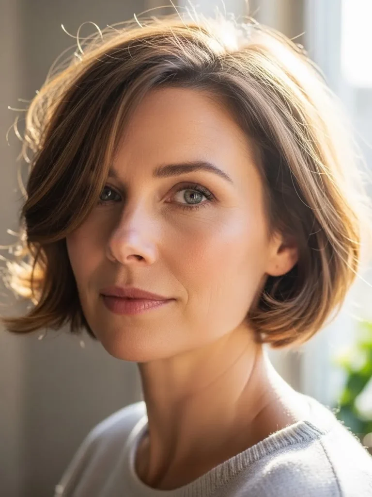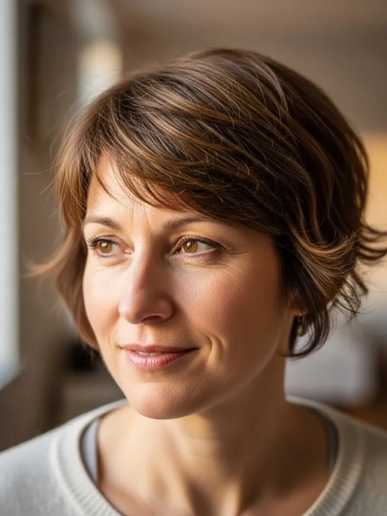 With a playful, textured look, this pixie cut combines soft layers and a bit of lift at the crown. The dark brown base with caramel accents gives the hair depth, while the side-swept bangs frame the face beautifully.