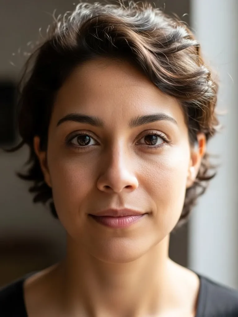 This modern pixie cut combines soft layers and gentle movement to create a full-bodied style. The rich brown color with subtle highlights adds depth, while the fullness around the crown gives the cut a voluminous shape.