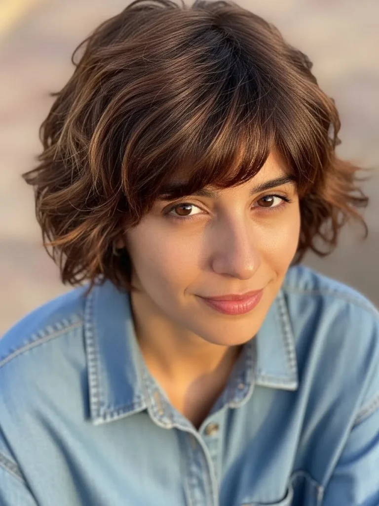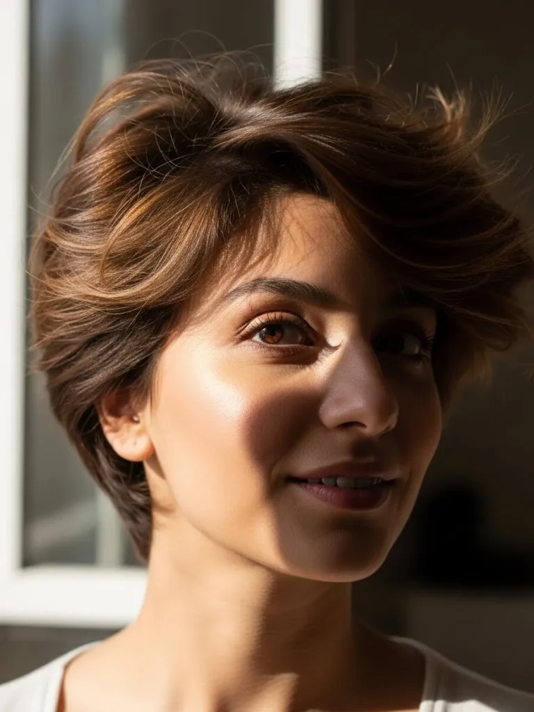 This pixie cut combines soft layers and tousled texture to create a naturally voluminous shape. The rich brown color with subtle highlights enhances the layers, while the loose waves add a playful touch.