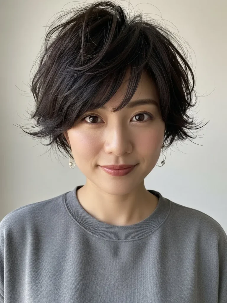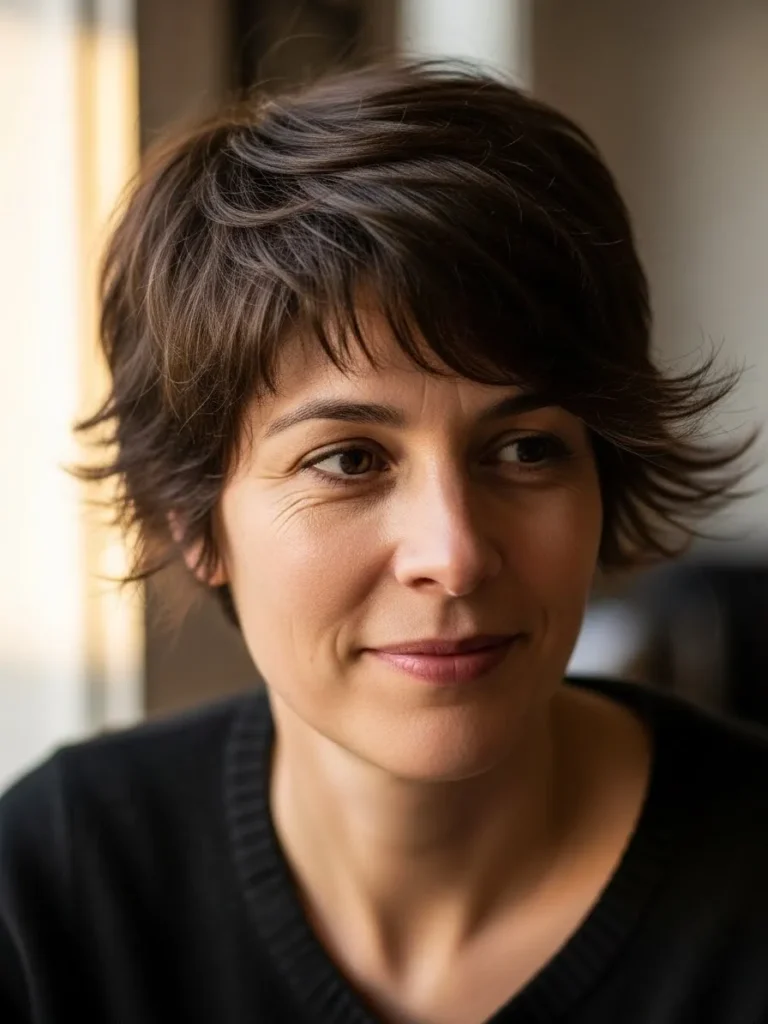 This pixie cut is all about natural texture and volume, with lifted layers at the crown that give it a bouncy, fuller shape. The dark brown hair with light highlights adds depth and dimension, while the tousled layers create a laid-back, carefree look.