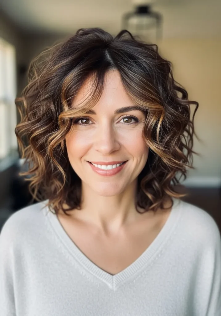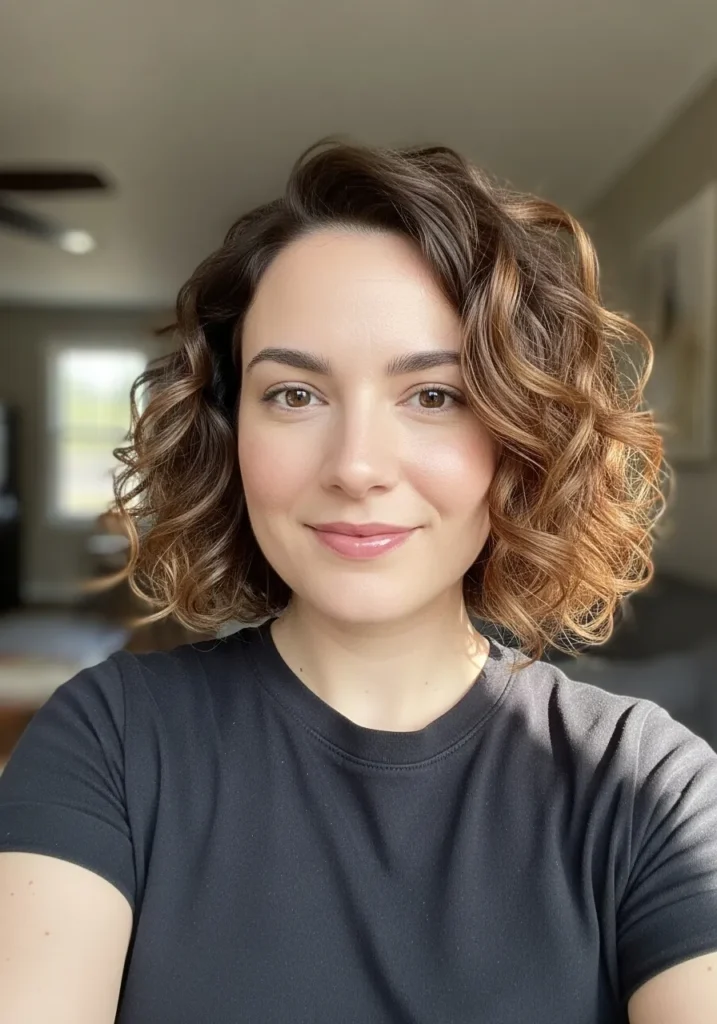 I love how this kind of bob frames the face without overpowering it. The curls open things up and add instant personality, and those caramel pieces make everything glow a little brighter. It is one of those styles that feels flattering on busy days because it looks chic even when I barely touch it. It just has that easy charm that makes me feel cute without trying too hard.