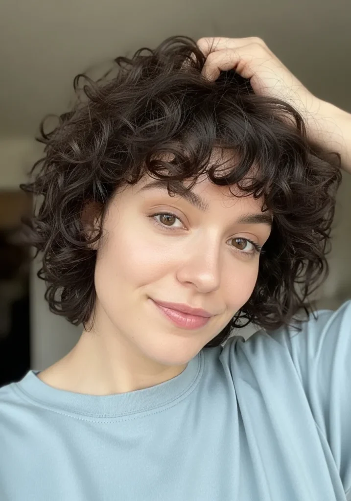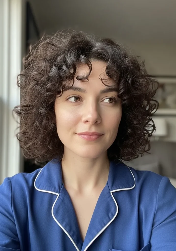 I love this style because it frames the face so gently and gives my curls room to do their thing without any fuss. The wispy fringe adds a cute touch without overwhelming my forehead and the layers keep everything from getting too heavy. It is the kind of curly bob that makes me feel polished even on days when I barely have time to look in the mirror.