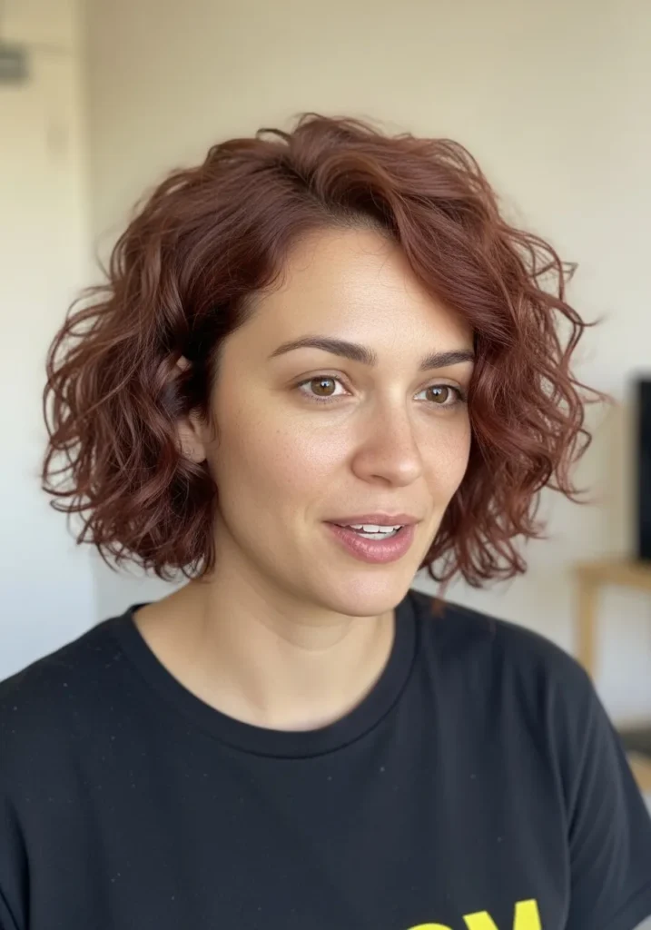 This curly bob sits right at the jawline with soft, airy volume that feels effortless and natural. The curls are loose and tousled with a mix of tighter spirals and fluffy bends that give the whole look a playful, textured finish. The warm auburn color catches the light beautifully and adds depth to every curl. Light layering around the crown helps the shape lift without looking puffy and the overall style feels breezy and low-maintenance.