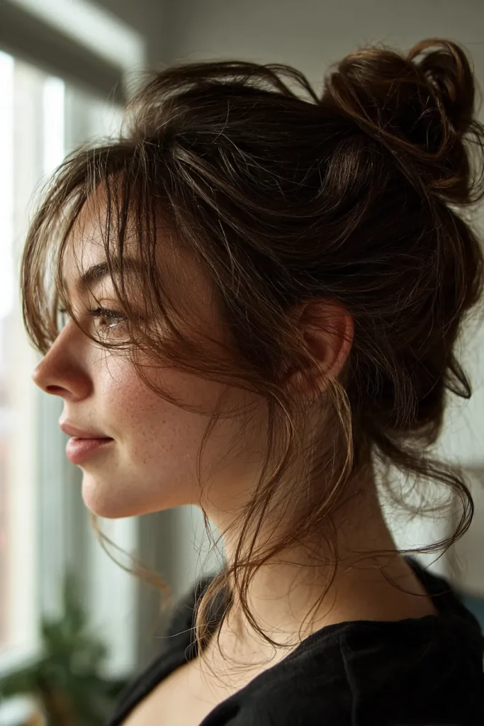This look features a voluminous high bun perched right at the crown of the head, which is a total lifesaver for long and heavy hair. The texture is intentionally undone and lived in with soft chocolate brown waves pulled back loosely to keep that natural bounce. Long wispy bangs and delicate tendrils around the ears frame the face perfectly. It shows off a gorgeous blend of rich brunette tones and subtle highlights that catch the light beautifully, even when your hair is tossed up in a hurry.