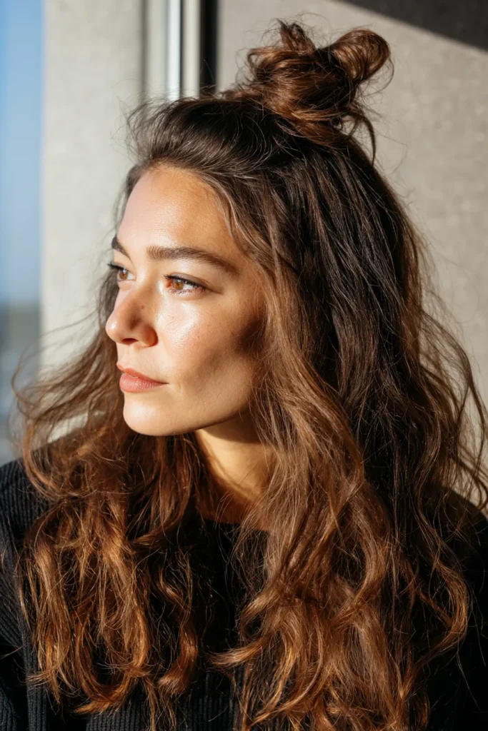 This style is the ultimate solution for showing off length while keeping thick hair under control. The look features a small messy bun secured at the crown with the rest of the hair flowing down in long, relaxed waves. The texture is wonderfully tousled and full of movement, showing off a warm chestnut brown color with sun-kissed golden undertones. It strikes a perfect balance between a structured updo and a free-spirited loose style that feels modern and fresh.