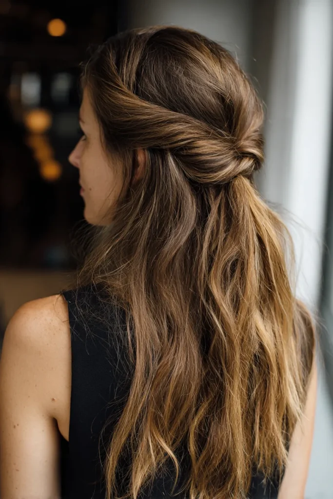 It’s a simple way to create a more lifted, put-together look. It manages to keep heavy hair away from the face while still letting you enjoy the full drama of long and wavy locks. This is the perfect choice for a day when you want to feel a little more glamorous without spending hours on a complicated updo.
