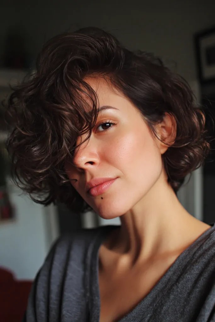 This short brunette bob is all about embracing natural movement and effortless texture. The cut falls just around the jawline with soft layers that encourage those beautiful curls to bounce and play. A deep side part creates a gorgeous sweeping effect across the forehead, which adds a bit of mystery and volume without needing a ton of styling products. The rich chocolate-brown color looks incredibly healthy and radiant in any light.