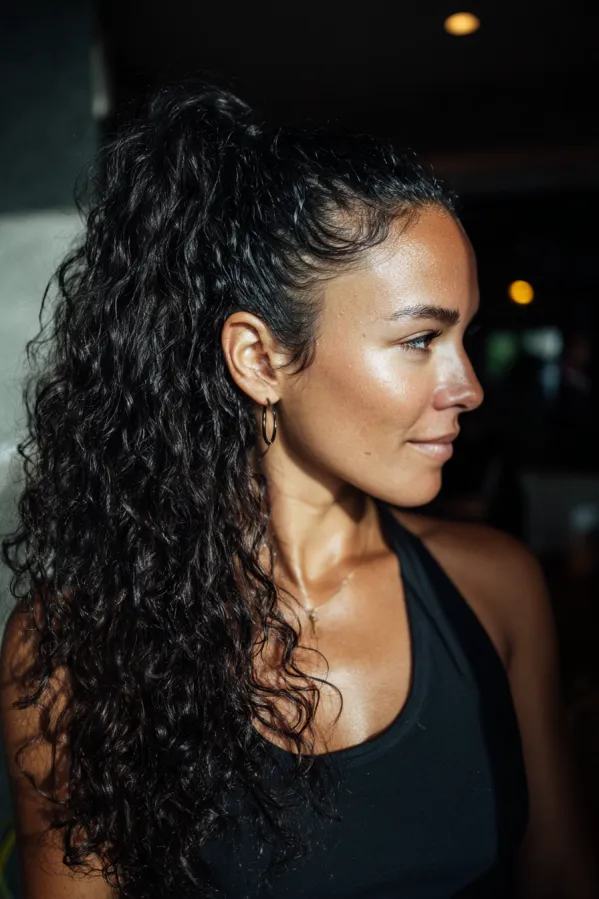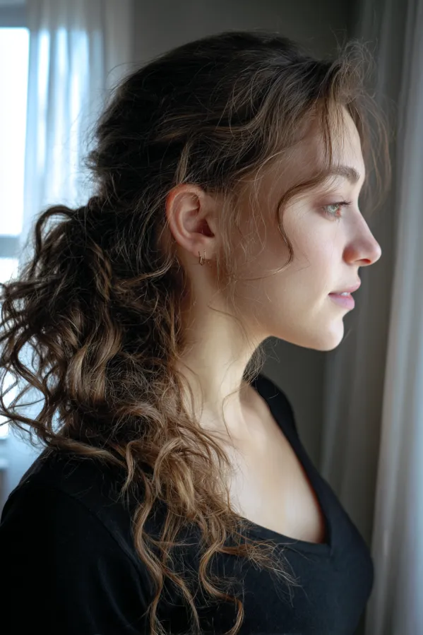 Here the long curls are gathered into a low ponytail with gentle volume and a slightly undone finish. The texture stays soft and natural, with a few wispy pieces framing the face for a relaxed touch.