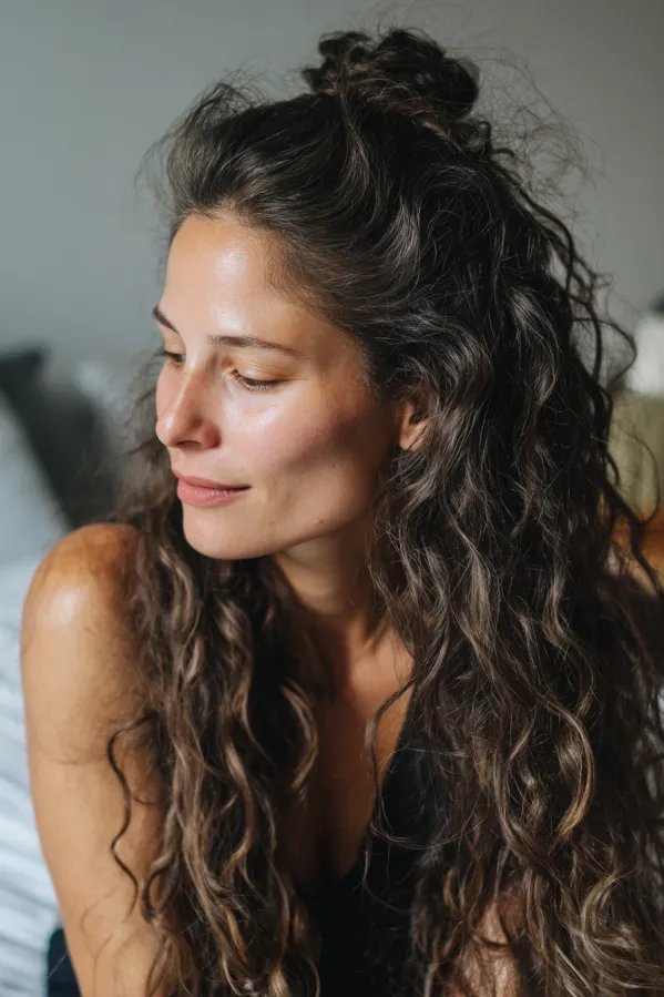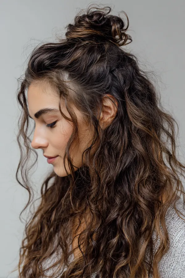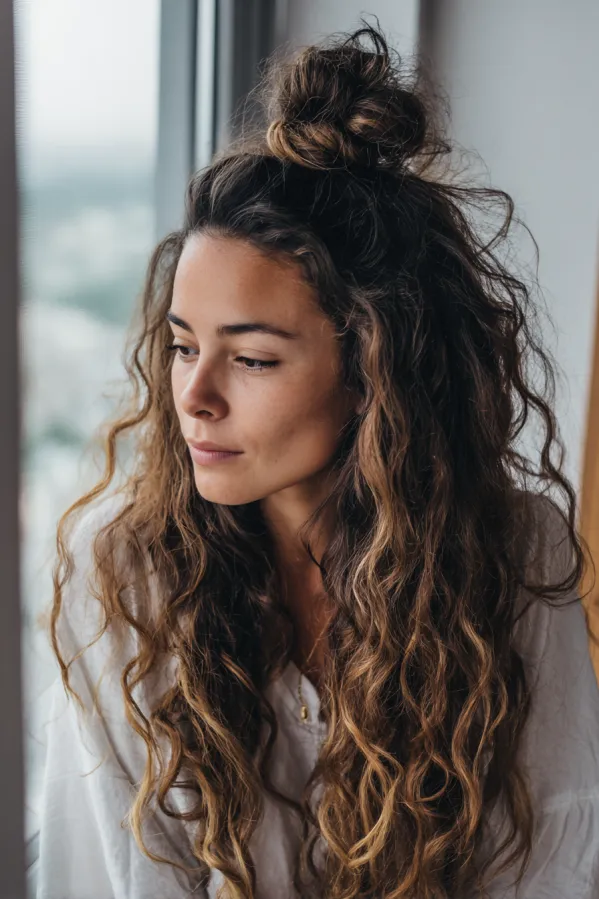 Here we have long curly hair styled into a relaxed half up bun with the rest left down in soft waves and curls. The texture looks airy and natural, with a slightly tousled finish that feels easygoing.