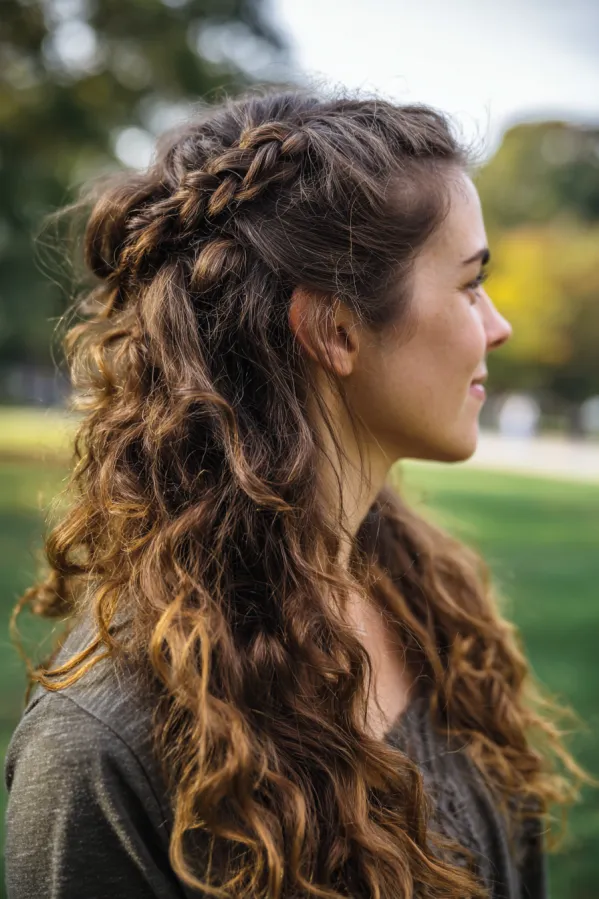 This look combines long curls with a loose braid woven along the side into a half up style. The curls are soft and slightly defined, creating a balanced mix of texture and detail.