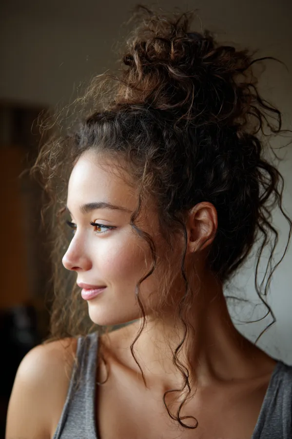 This style pulls long curly hair into a relaxed top knot while leaving a few soft tendrils loose around the face. The curls are slightly tousled with natural texture, giving that effortless and airy feel.