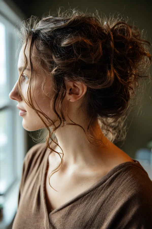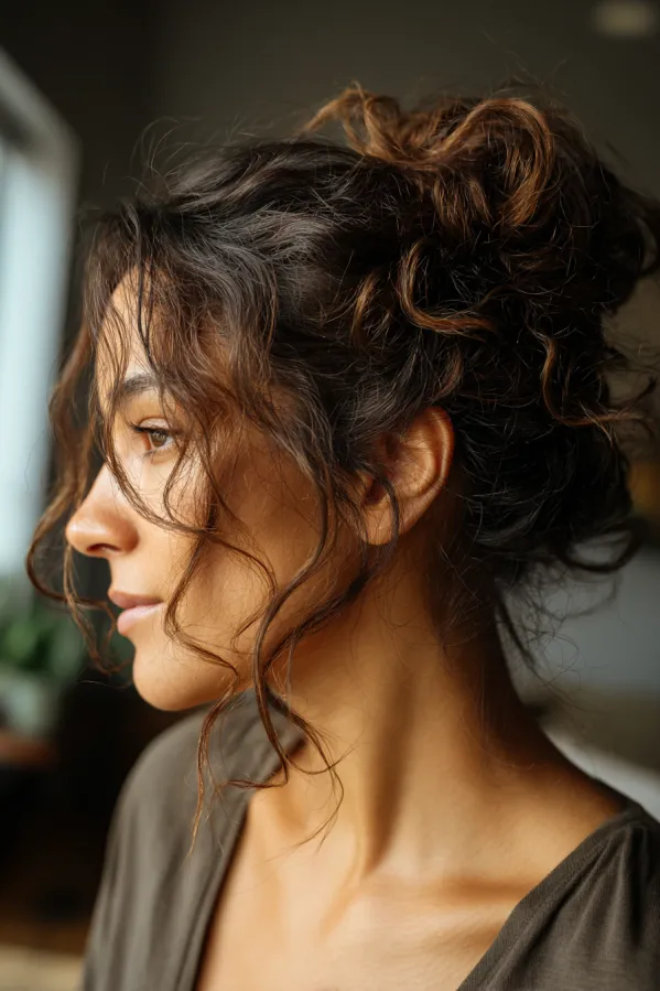 This look pulls long curls into a loose bun with soft pieces left out around the face. The texture is slightly messy with natural volume and a few highlighted strands adding dimension.