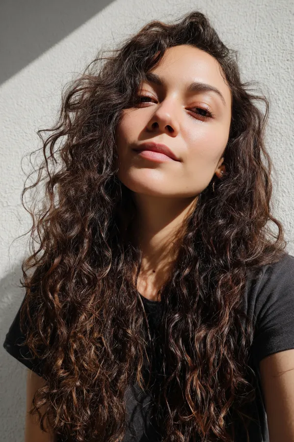 Here the long curly hair is worn down with soft layers that add movement and shape. The curls are loose and slightly tousled with a natural shine that keeps everything looking fresh and easy.