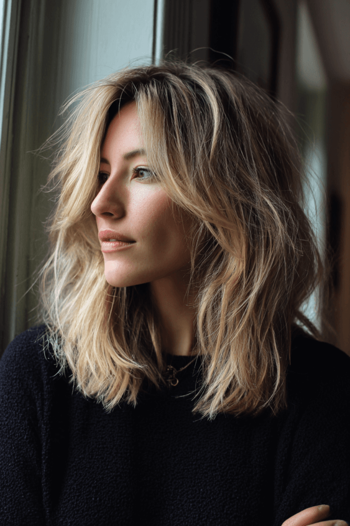 A layered medium-length haircut works well if you enjoy the volume and flow of a shaggy lob but prefer to keep more length. The layers add shape without losing that relaxed feel.