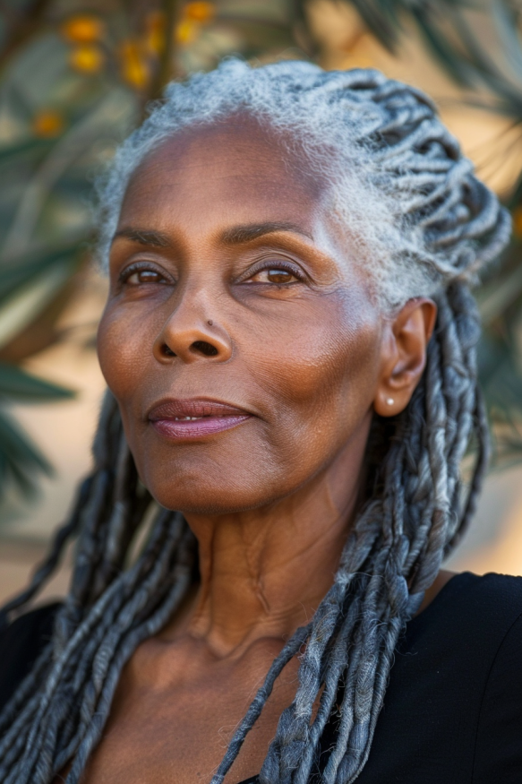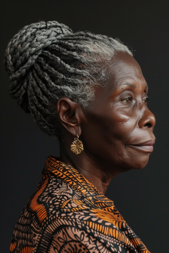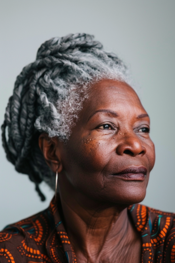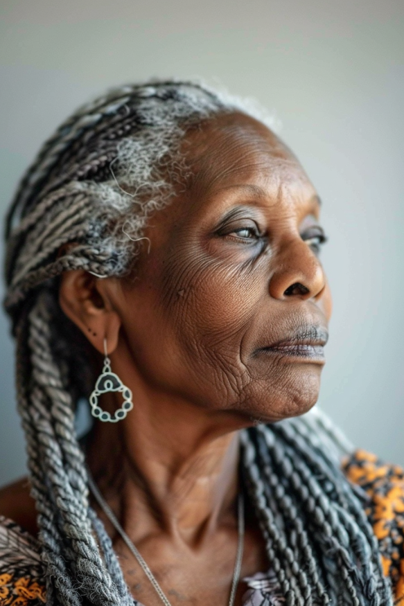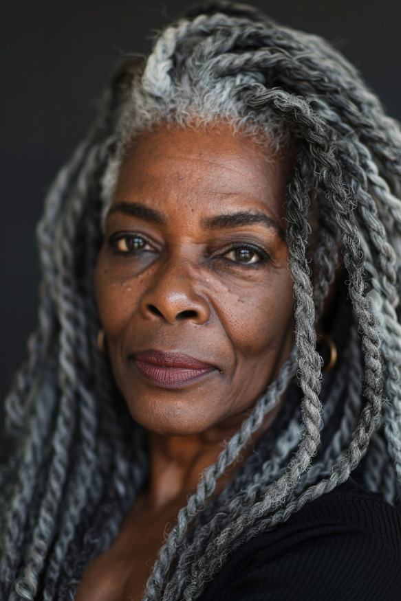 I love how this hairstyle feels so light and airy. It has movement, softness, and that perfect lived-in texture that doesn’t try too hard. The gray tones make it feel wise and powerful, but the twists keep it youthful and fresh. Honestly, this is one of those styles that just makes you feel beautiful the second you put it on. It’s graceful and easy to love.