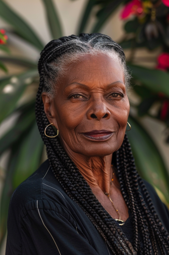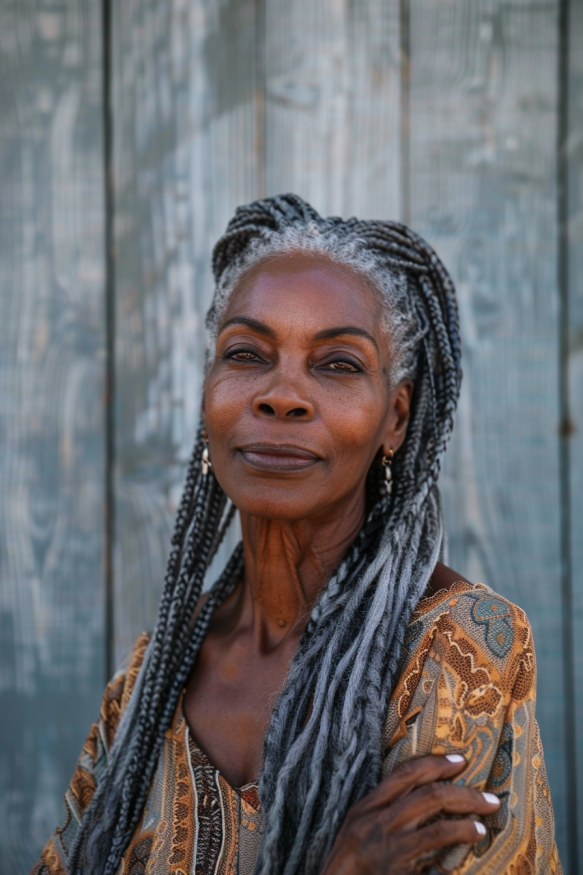I really enjoy how this style balances tradition with elegance. It’s giving graceful and grounded at the same time. The neat rows up top make it feel tidy and put together, while the long, draped braids bring in that soft, flowing vibe. It’s perfect for showing off natural grays while still having a protective style that lasts. I’d absolutely recommend this for anyone wanting something timeless and low-fuss that still looks fabulous.