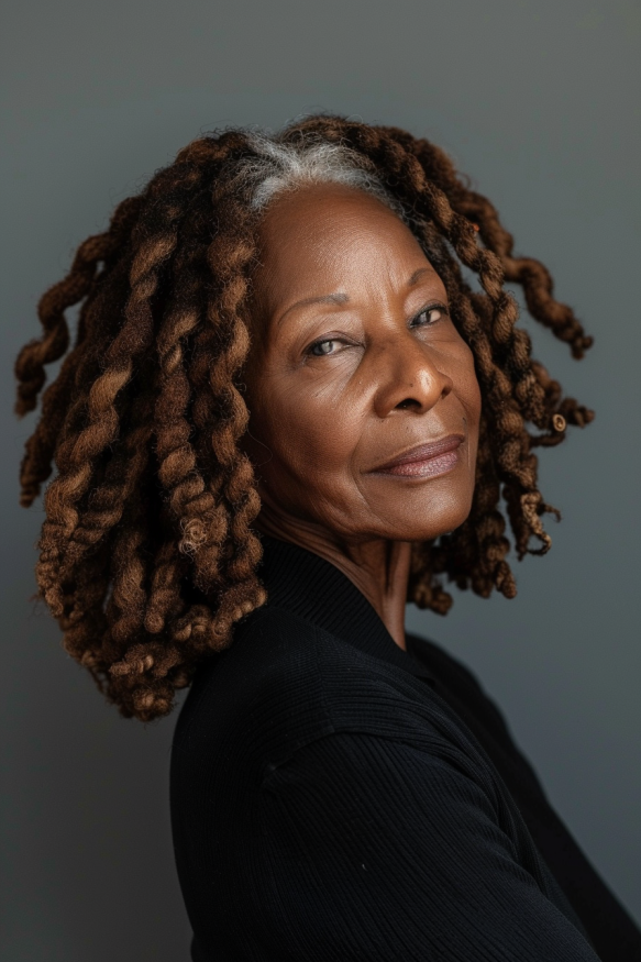 This playful look features short, chunky twists styled into a voluminous twist-out. The hair has been separated for extra bounce, giving it a full, rounded shape that flatters the face beautifully. Auburn tones dominate the ends, while the natural gray at the roots creates a soft contrast that feels both earthy and fresh.