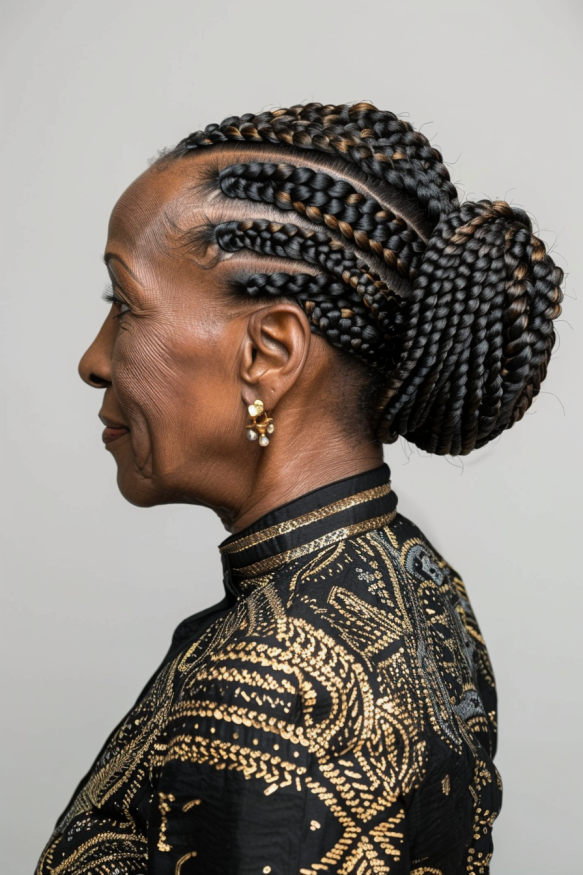 This elegant hairstyle features sleek cornrows braided straight back and gathered into a low, sculpted braided bun. The braids are tight and uniform, creating a smooth, sophisticated look from front to back. Subtle copper highlights are woven throughout, adding a warm glow without overpowering the overall style.