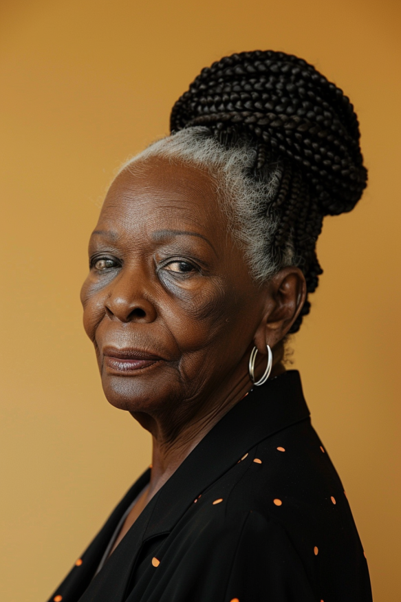 This showstopping look features dozens of small braids swept upward into a tall, rounded bun that sits high and proud. The hairline is left natural with soft gray roots that peek through, creating a lovely contrast against the dark, polished braids. The bun itself is perfectly shaped and stacked for maximum volume without bulk.