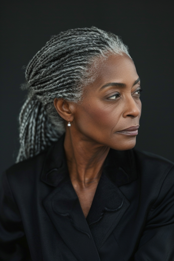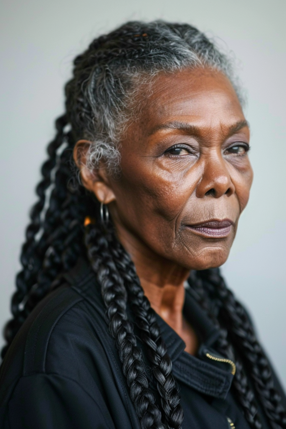 This stunning style features medium-sized braids that are styled with a deep side part and gently swept over the shoulder. The braids are tight, neat, and uniform, with a smooth finish that gives the whole look a clean and structured feel. The contrast between the natural silver roots and the rich dark brown braids adds depth and brings out the beauty of her natural hairline.