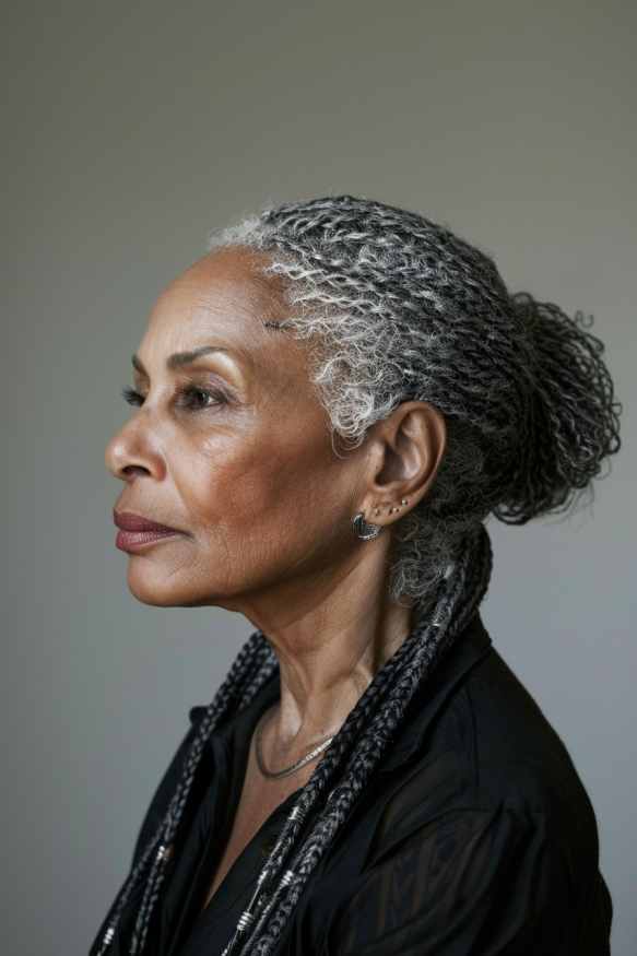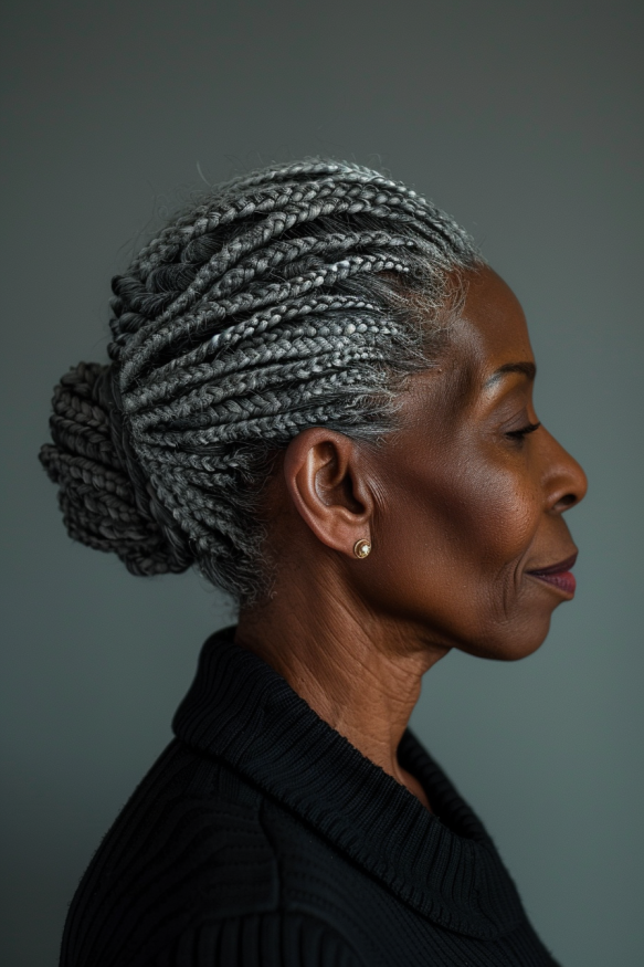 This elegant look features small to medium-sized braids that are pulled neatly back into a low braided bun. The gray strands are blended throughout, giving the style a soft shimmer without overpowering the overall shape. Each braid is tightly done, creating a clean, uniform look that hugs the scalp beautifully and flows seamlessly into the sculpted bun at the nape.
