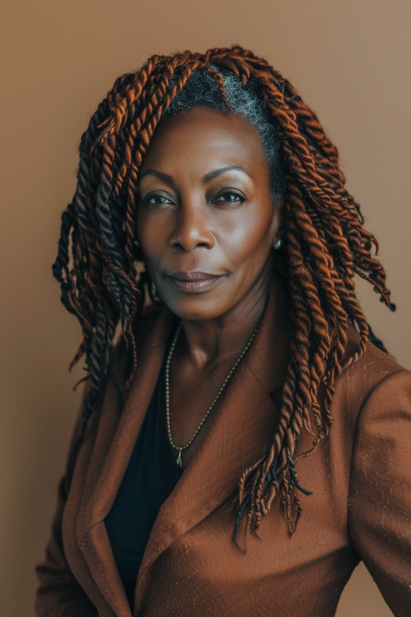 This hairstyle features chunky twist braids in a rich auburn tone, styled to fall gracefully over one shoulder. The twists are soft but defined, creating volume without bulk. A subtle sweep from the crown to the side adds movement and a touch of drama. A hint of natural gray near the roots brings in a beautiful contrast that feels both bold and authentic.
