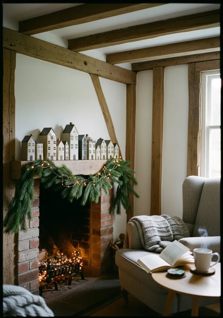 This small brick fireplace gives off pure countryside comfort. A simple garland of fresh pine needles drapes over the rustic wooden mantle, with tiny fairy lights adding a soft twinkle. The little wooden houses on top bring such a sweet, nostalgic touch.