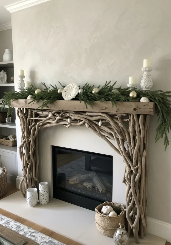 This design is all about natural textures and beachy elegance. The mantle is framed by intricate driftwood branches, topped with evergreen garland, ivory candles, and delicate ornaments. Soft neutrals and organic materials create a relaxed coastal holiday look.