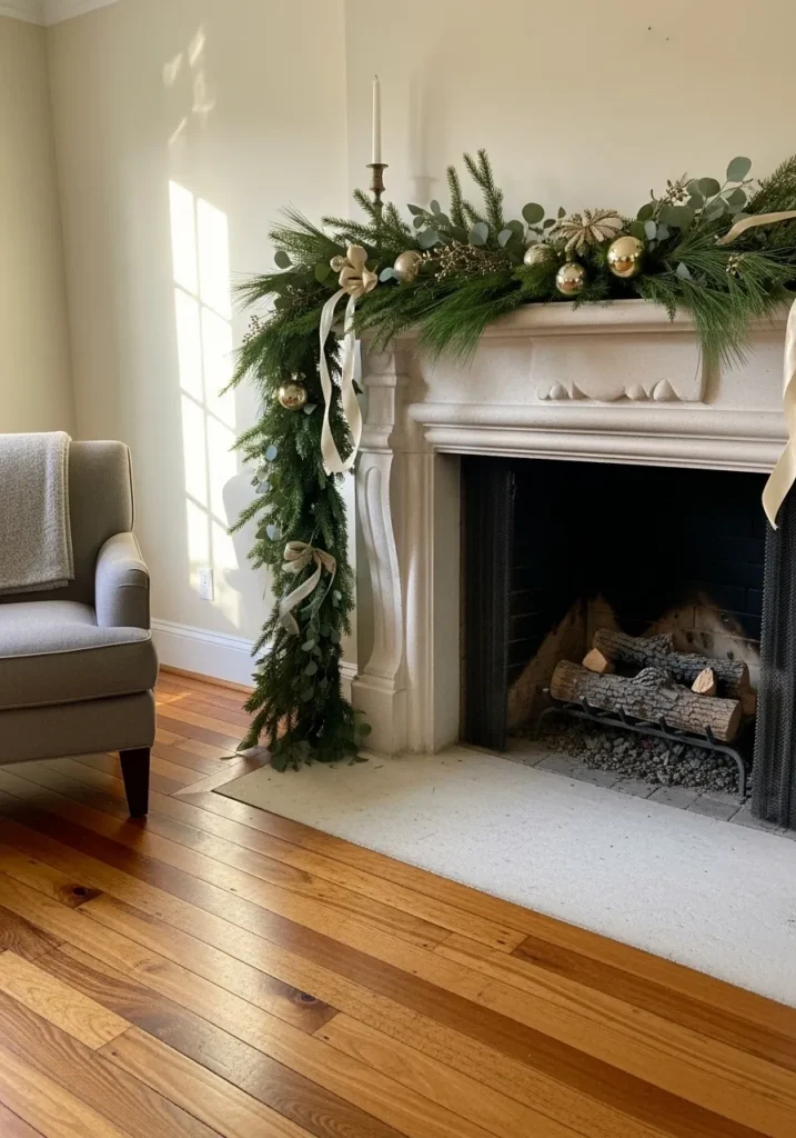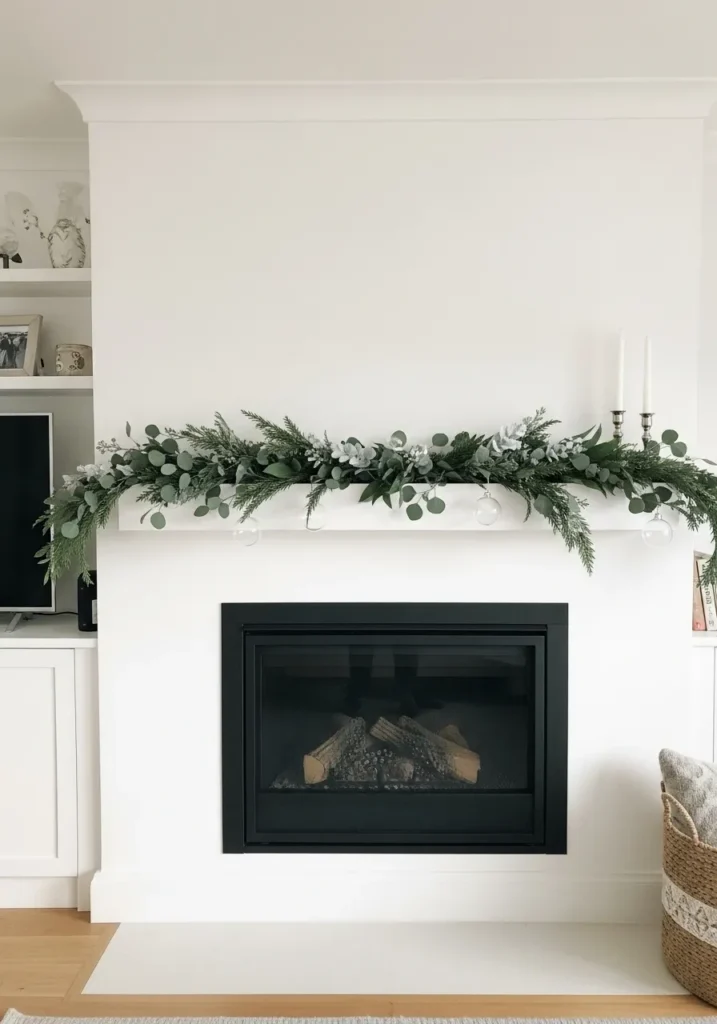 This clean and balanced setup showcases a white mantle decorated with fresh green garland and soft eucalyptus leaves. A few clear glass ornaments hang beneath, adding just a touch of sparkle. The overall look is modern yet timeless, fitting seamlessly into a bright, airy space.