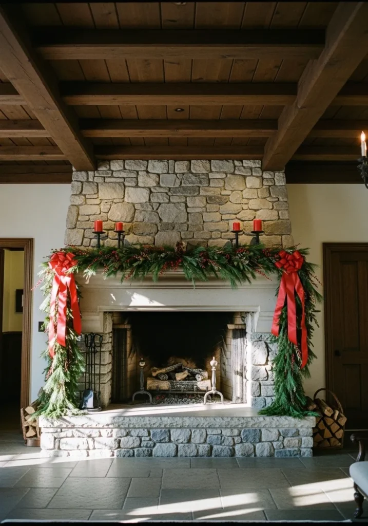 This stone fireplace radiates warmth with its lush garland of evergreens, pinecones, and bright red ribbons. The natural textures of the stone mix beautifully with the deep greens and reds, creating a look that feels traditional yet full of personality. The soft glow of afternoon sunlight adds even more charm.