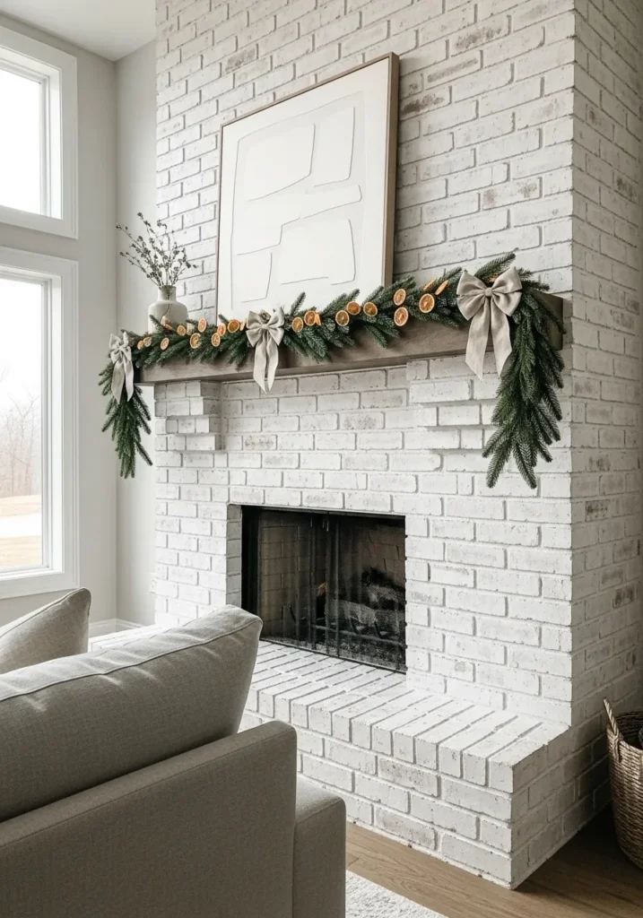 This light and airy white brick fireplace takes a fun, natural approach to Christmas decor. The garland is dressed with dried orange slices and linen bows, creating a cheerful contrast against the clean brick background. A minimal art piece above the mantle keeps the look modern and uncluttered.
