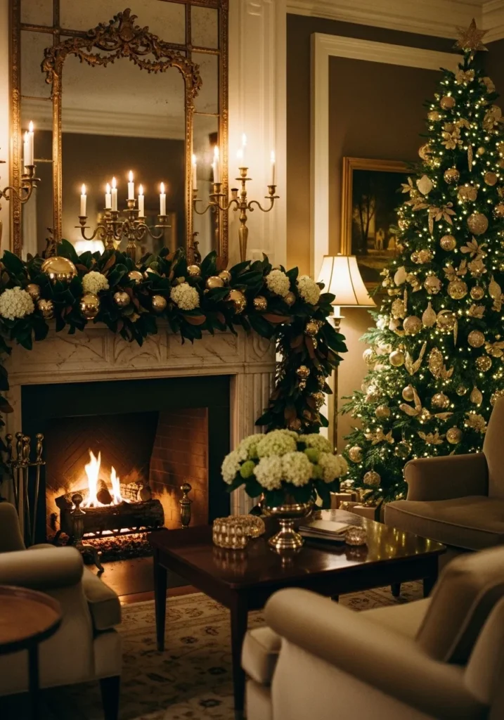 This elegant living room glows with golden light and classic charm. A rich garland of magnolia leaves, hydrangeas, and gold ornaments crowns the marble fireplace, mirroring the golden tones of the mirror and candelabras above. The soft firelight ties everything together in a warm, luxurious way.