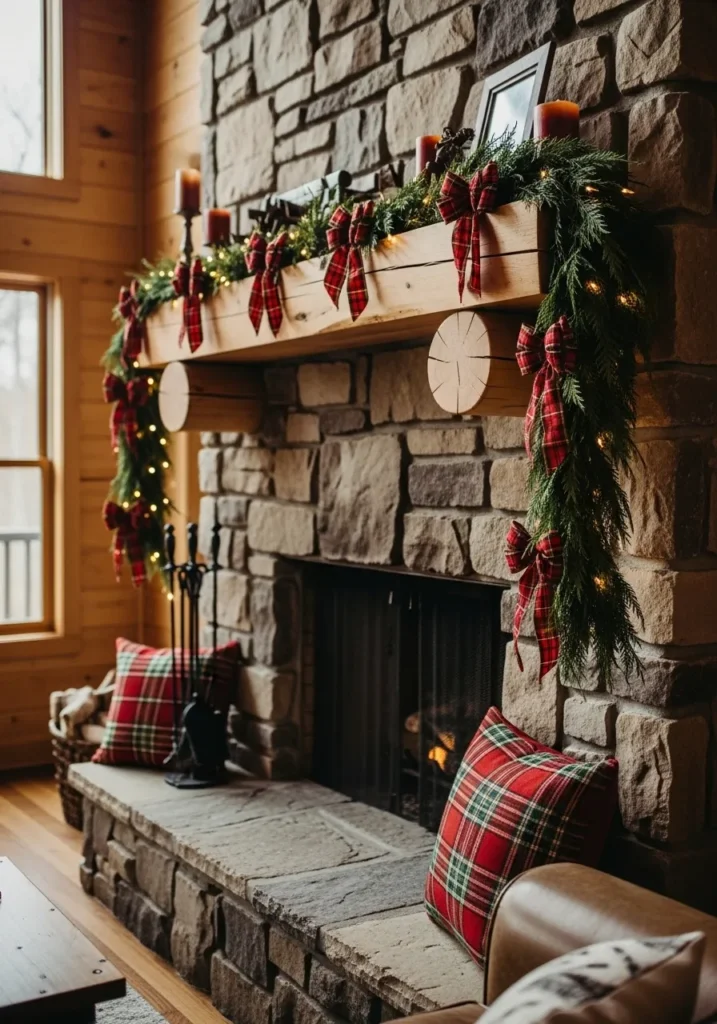 This rustic stone fireplace captures the spirit of a cozy cabin Christmas. Evergreen garlands trimmed with twinkling lights and red plaid bows stretch across the mantle, tying in beautifully with the matching pillows below. The warm wood tones and stone textures make it feel extra comforting.