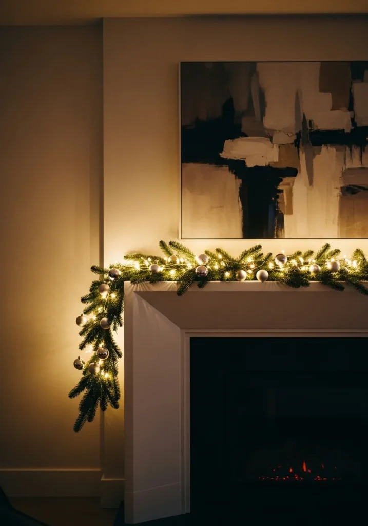 This modern mantle glows with simplicity and sophistication. A thick, lush garland of evergreen branches runs across the top, twinkling with golden fairy lights and silver baubles. The clean white fireplace and abstract wall art behind it give the whole look a polished, contemporary edge.