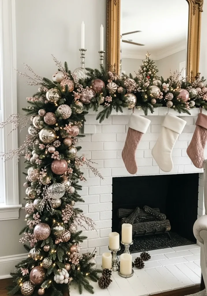 I’m obsessed with how luxurious yet calming this looks. The blush tones feel modern and feminine, and the metallic ornaments bring that extra “wow” factor. It’s the perfect mix of cozy and chic, like a Christmas design straight out of a dream home.