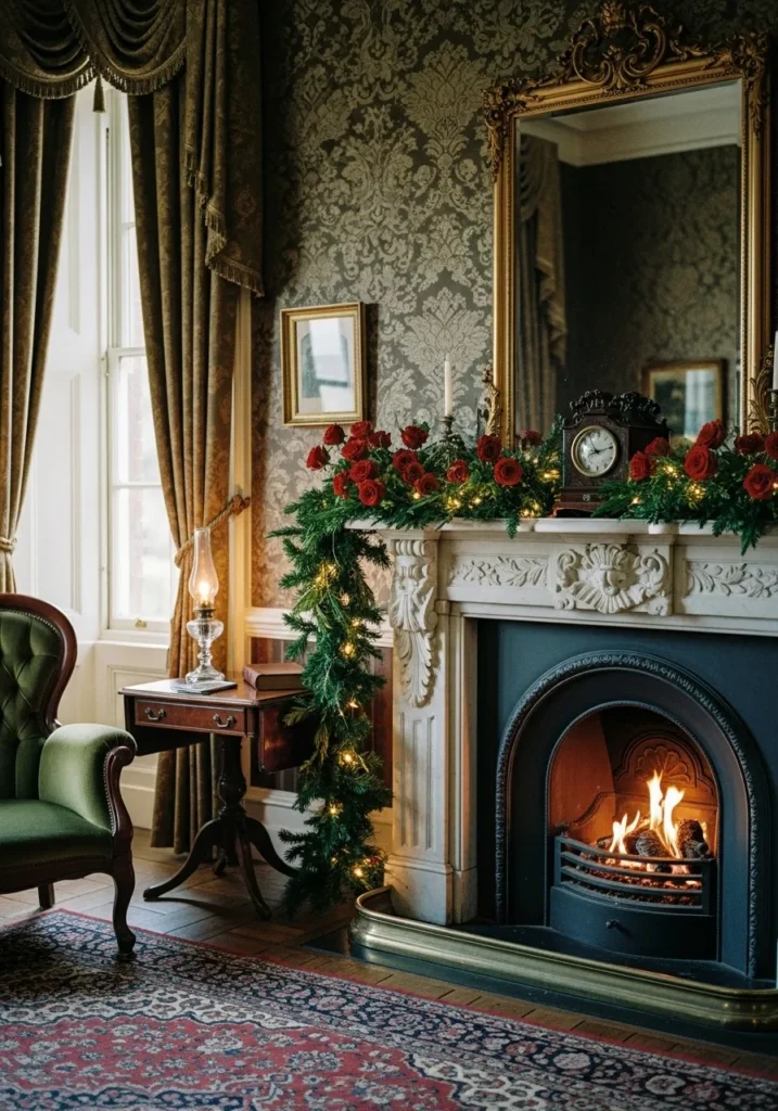 This ornate fireplace captures pure vintage beauty with its carved detailing, golden mirror, and garland of deep red roses. Twinkling lights are woven among the greenery, creating a warm glow that reflects off the patterned wallpaper and classic furnishings.